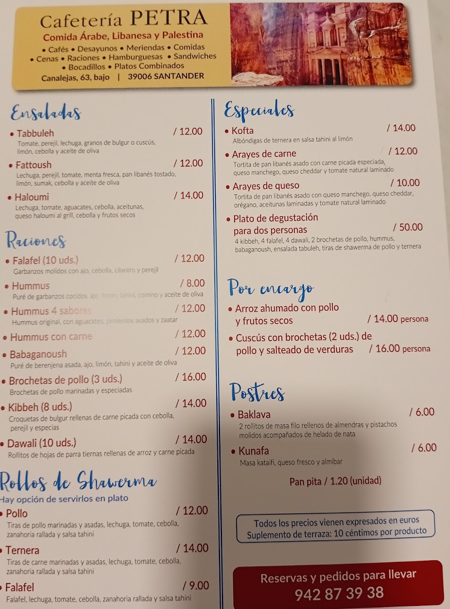 Welcome to Cafeteria Petra, a hidden gem nestled in the heart of Santander. This delightful cafeteria offers a vibrant menu that beautifully merges Mediterranean flavors with local favorites. The standout dishes include the Shawerma De Falafel, which combines fresh vegetables and tangy tahini sauce, served alongside crispy fries for just €10.80. Sandwich lovers will adore the Sandwich Primavera, a flavorful medley of ham, egg, and asparagus at €6.50.